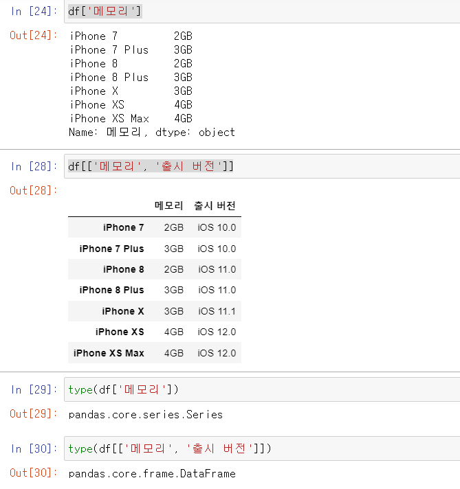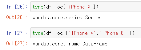 여기서 한 가지 짚고 넘어가자면 위의 예시에서 하나의 인덱스를 뽑을 때와 여러 인덱스를 뽑는 것은 데이터 타입이 다릅니다! 아래를 보면 알 수 있듯 하나의 인덱스를 뽑는 것은 Series 형식이고 여러 개를 뽑는 것은 DataFrame입니다.