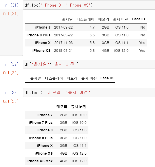 -. DataFrame의 인덱스(Row)를 슬라이싱하는 것 : df.loc[Row:Row]