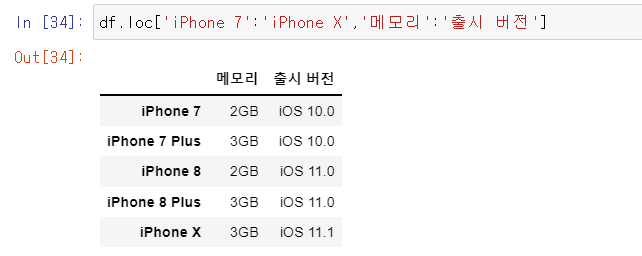 -. DataFrame의 인덱스와 Column을 슬라이싱하는 것 : df.loc[Row:Row, Column:Column]