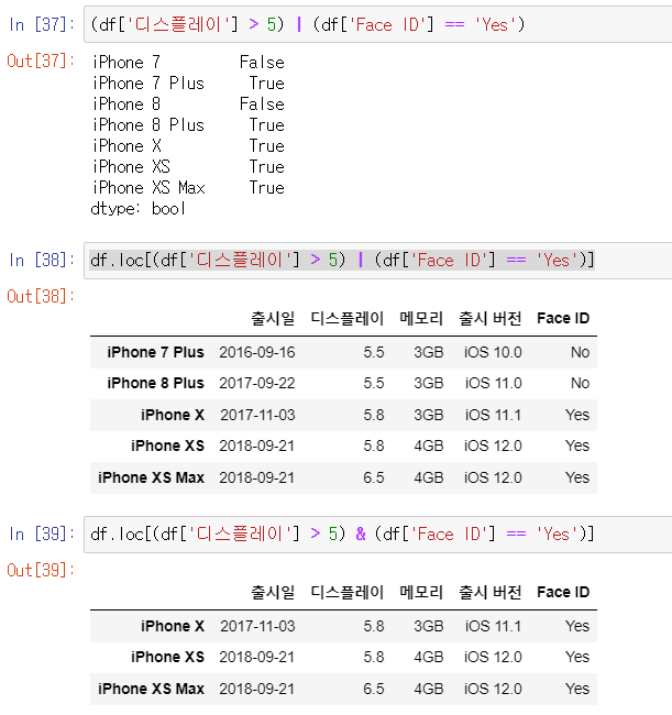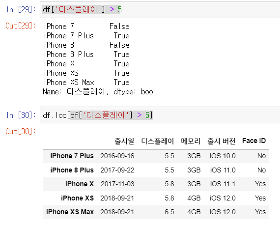 위의 16번 Cell에서는 df의 인덱스들 중에서 첫 번째(iPhone 7), 두 번째(iPhone 7 Plus), 다섯 번째(iPhone X), 일곱 번째(iPhone XS Max)만 True이므로 출력이 되었고, 27번 Cell에서는 column 중에 첫 번째(출시일), 네 번째(출시 버전)만 True이므로 출력합니다.