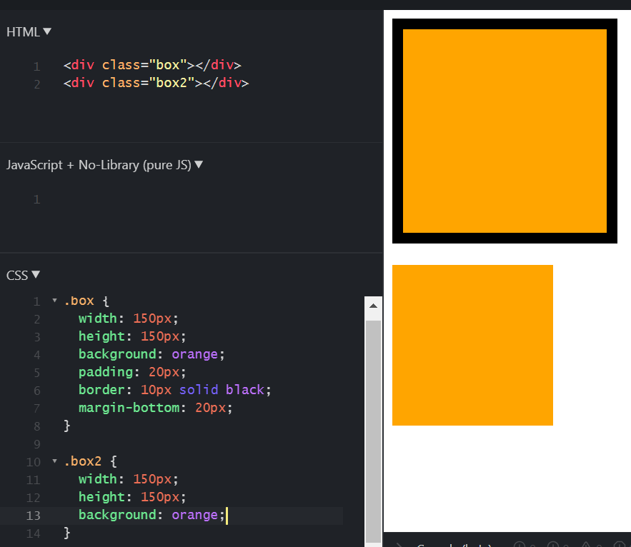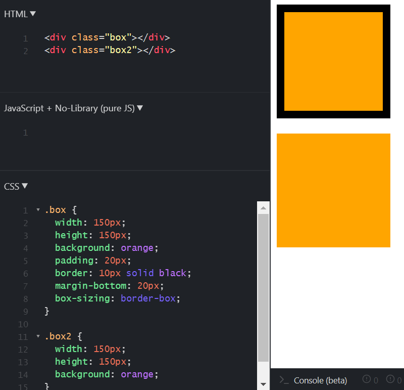 위의 box가 border-box 개념이고 아래 box2가 실제 content box입니다. box2에서 padding과 border을 추가함으로써 영역이 커진 것을 확인할 수 있습니다. 여기서 padding/border 추가를 하지만 전체 width와 height를 유지하고 싶다면 box-sizing: border-box; 를 추가해주면 padding영역과 border를 감안하여 width/height가 content-box와 동일하게 만들 수 있습니다!