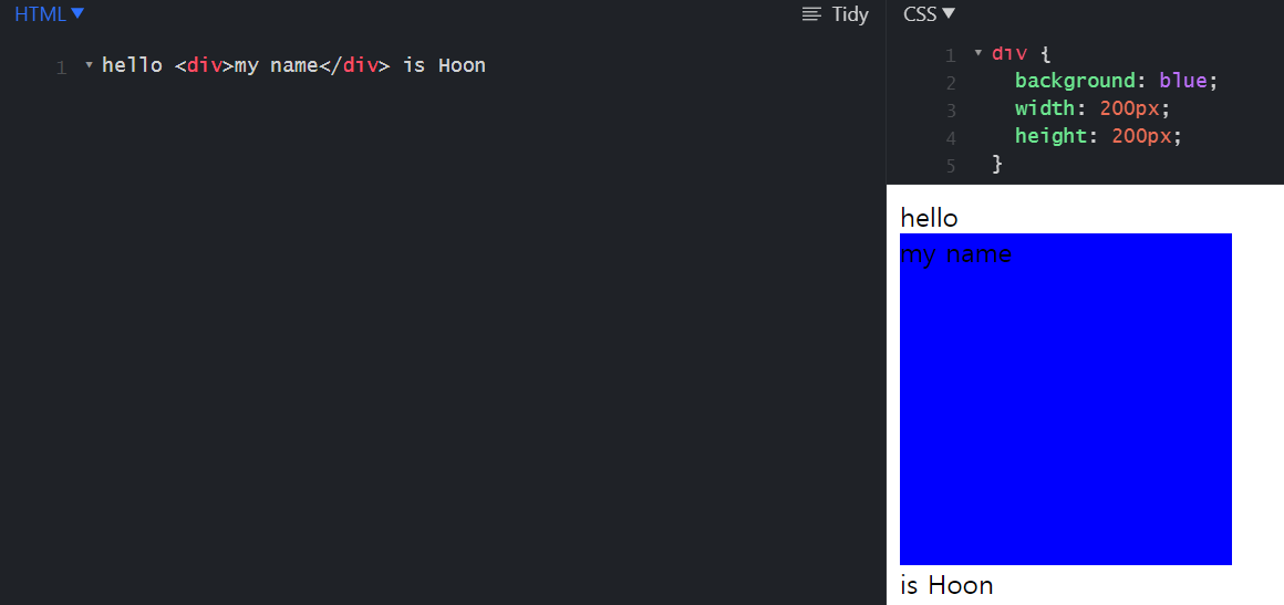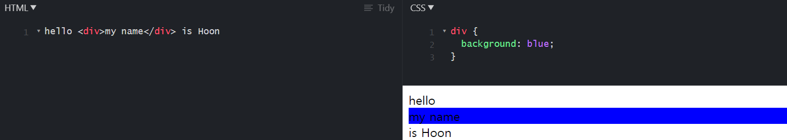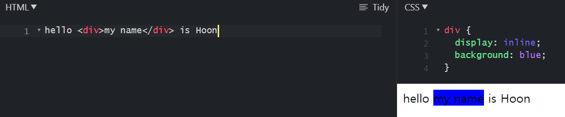 inline과 block을 display 속성 선언을 통해 바꿀 수 있습니다. 위에 <div>를 inline요소로 바꿔보겠습니다.