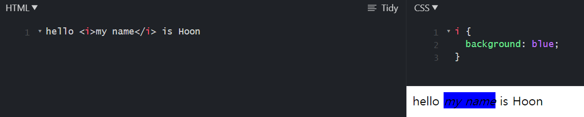 <i>와 <b> 둘 다 display 기본 값은 inline이지만, <b>만 inline-block으로 변경시켜주니 위와 같이 영역 설정이 가능해졌습니다!