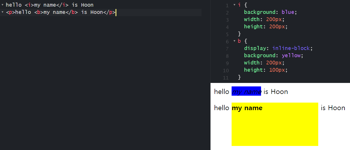 <i>와 <b> 둘 다 display 기본 값은 inline이지만, <b>만 inline-block으로 변경시켜주니 위와 같이 영역 설정이 가능해졌습니다!