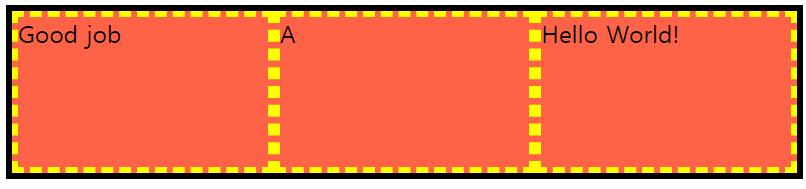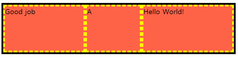 위의 예제에서 확인이 가능하듯 auto인 경우에 각각의 박스 안에서 텍스트(요소)가 차지한 너비를 제외한 여백의 너비가 같도록 조절이 됩니다! auto가 아니라 0이라면 텍스트를 포함한 item 전체의 너비가 같아지게 됩니다!
