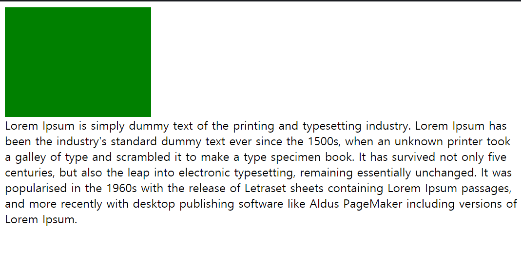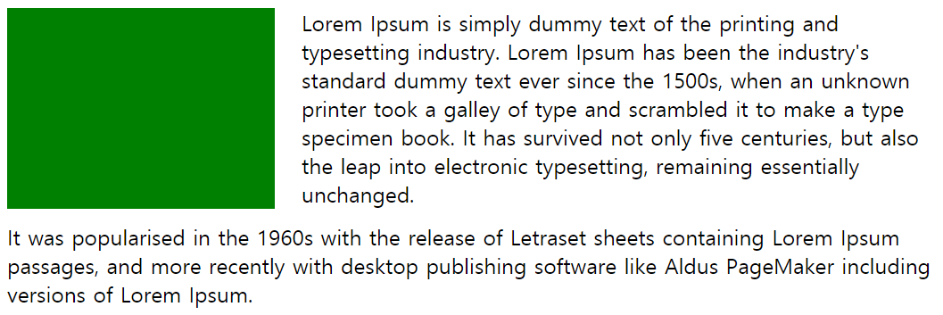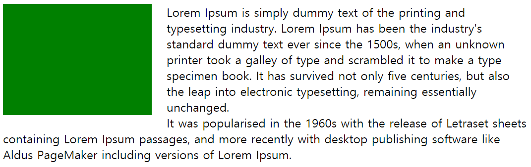 여기서 float를 해제하는 태그인 clear까지 확인해 보겠습니다. 위의 글에서 3번째 줄(It was popularised~)부터는 float에 영향을 안 받고 왼쪽에서부터 다시 시작하게 만들어 보겠습니다. 3번째 줄부터 div태그로 묶어서 clear를 적용하고 안 하고를 비교하겠습니다. (코드는 페이지 양이 많아지므로 clear: left; 를 작성한 것만 추가하고 이미지로 구분하겠습니다)