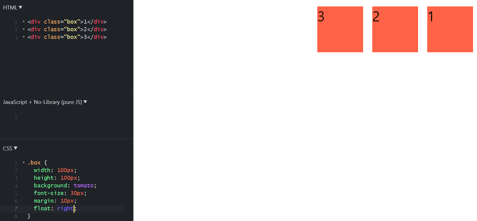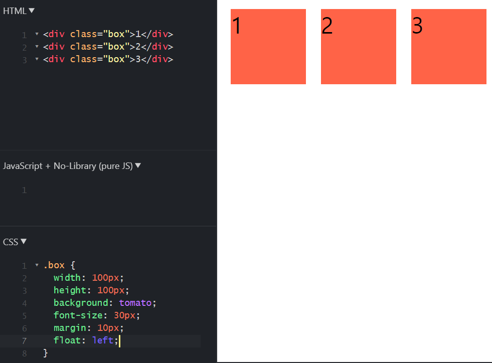 즉, float는 요소를 좌우 방향으로 띄우는 속성으로 수평 정렬에 사용을 할 수 있습니다. 비록 최근에는 flex 속성이 나와서 float의 사용 빈도는 줄었지만 정리해보겠습니다. 이해하기 쉽게 하기 위해 실제 코드로 정리하겠습니다.