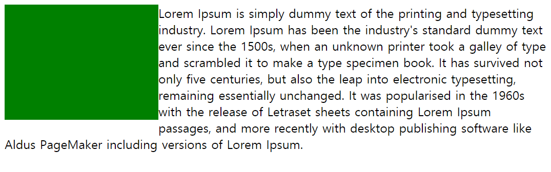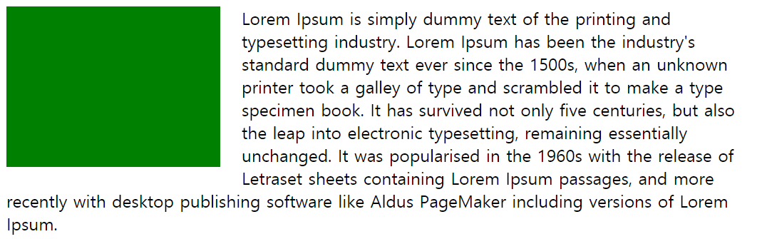 여기서 float를 사용하면 신문에 나오는 것처럼 그림 옆으로 글이 자연스럽게 흐르게 됩니다. 아래 코드 및 결과를 참고하시면 쉽게 이해가 갈 것 같습니다.