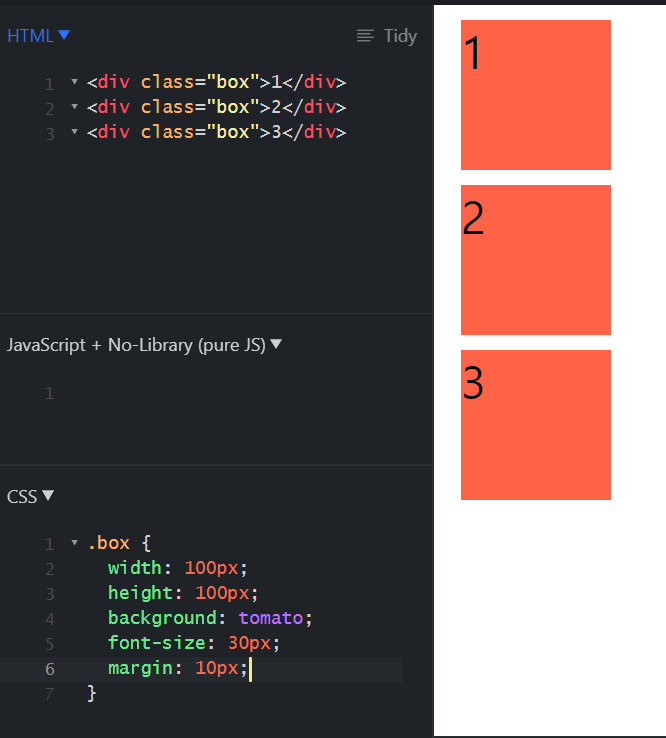 이제 float로 수평 정렬하는 법을 정리하겠습니다. 먼저 div를 이용하여 box를 3개 만들어보면 div태그는 block 속성을 가지기 때문에 3개의 box가 수직으로 정렬된 것을 확인할 수 있습니다.