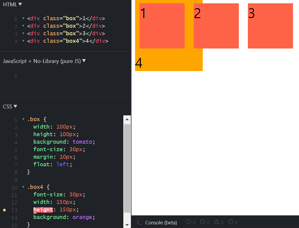 지금까지 float의 정렬에 대해 다루었는데요, 여기서 문제점이 발생하게 됩니다. 위의 3개 box를 수평 정렬한 후 새롭게 하나의 박스를 만들면 겹치지 않고 밑에 만들어지는 것을 생각하고 있었는데, 새로 생기는 박스가 기존의 박스들과 겹치게 생성되는 것을 확인할 수 있습니다.