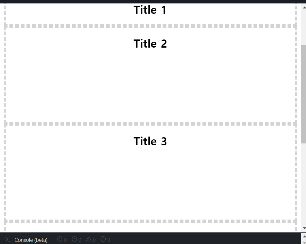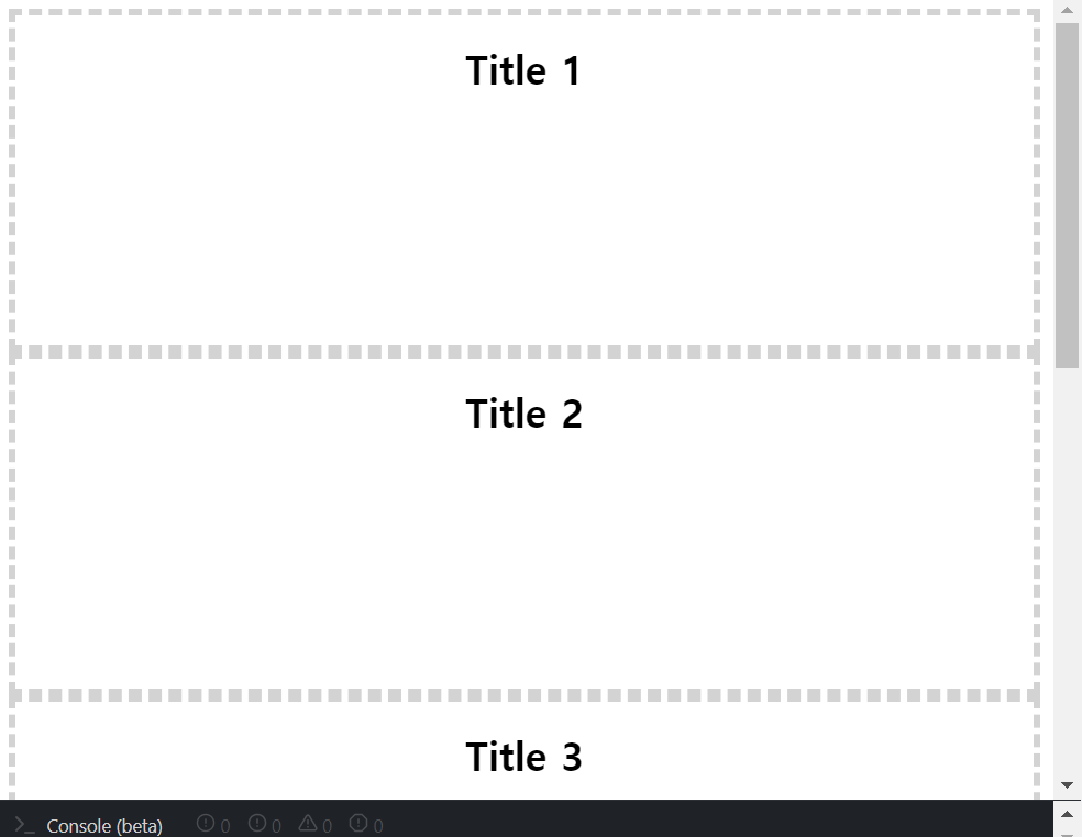 마지막으로 sticky에 대해 정리하겠습니다. sticky는 스크롤 영역 기준으로 배치하는 속성 값입니다. 코드와 이미지로 설명드리겠습니다. 첫번째 이미지를 보면 스크롤을 안 내린 처음 상태인데 제일 상단에 Title 1이 있습니다. 여기서 스크롤을 Title 2 위까지 내리면 두 번째 이미지처럼 Title 1이 top: 0 위치에 붙어있는 것을 확인할 수 있습니다!