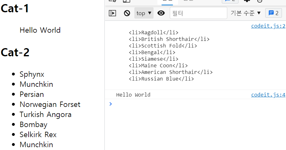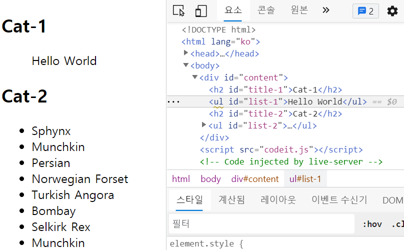 출력뿐만 아니라 HTML 자체를 수정할 수도 있습니다. (기존에 있던 값을 새로운 값으로 교체하는 것이므로 주의!)