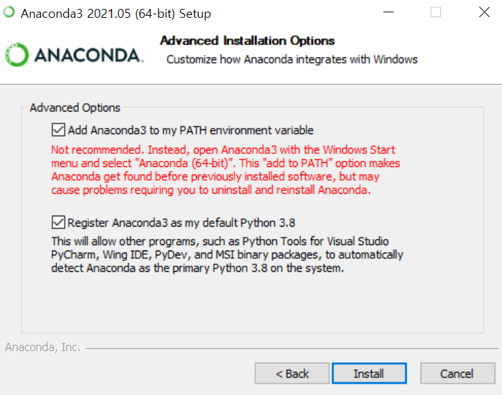 설치 과정 중 선택하면 편한 옵션으로는 Add Anaconda3 to my PATH environment variable 옵션입니다. 이 옵션을 선택해주면 명령 prompt 창(git, powershell, cmd)과 같은 환경에서 anaconda를 사용할 수 있습니다. (체크하지 않는다면 windows에서 시작 메뉴 아이콘을 클릭하는 방법으로만 Anaconda Navigator를 실행할 수 있습니다.)