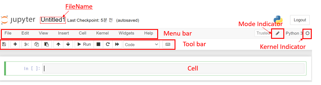 Kernel Indicator는 Kernel의 상태를 표시합니다. 이미지와 같이 속이 빈 동그라미인 경우 커널이 쉬고 있는 것이며 실행 중이라면 ●와 같이 속이 찬 동그라미로 변경이 됩니다. 실행 중일 때 Toolbar의 ■를 눌러주면 실행을 중지시킬 수도 있습니다.