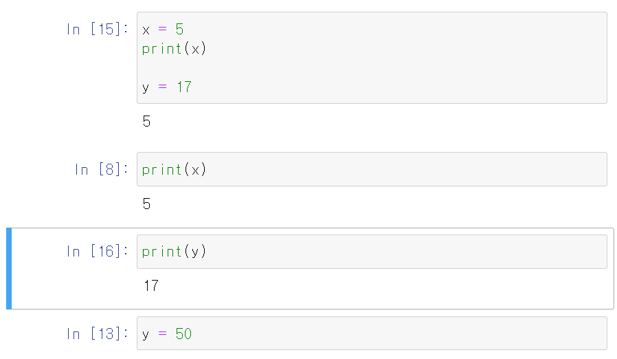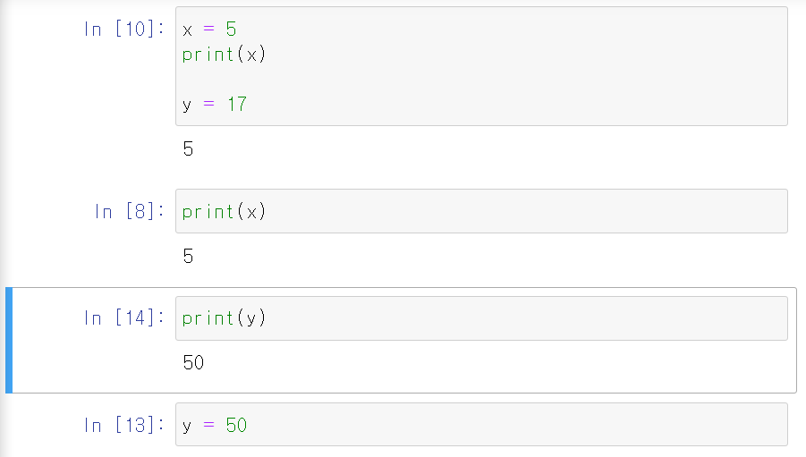 그럼 다시 위의 10번을 실행하고 print(y)를 실행하면 어떻게 될까요? 위에서 정리하였듯 jupyter notebook에서 Cell의 실행 순서가 중요하기 때문에 print(y) 전에 10번을 다시 실행하면 y는 다시 17이 됩니다!