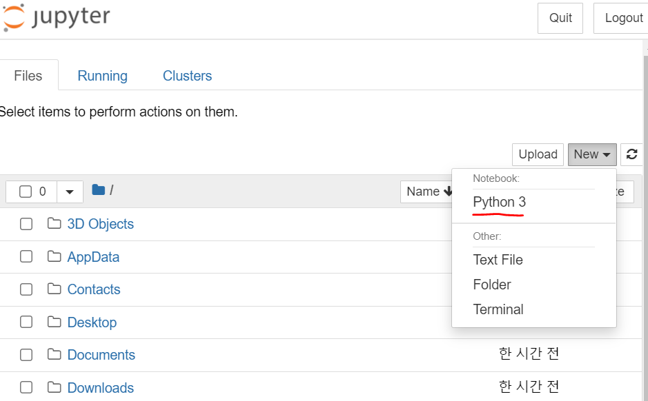 지난 시간에는 Jupyter Notebook 설치 및 실행에 대해 정리했습니다. 이번엔 Jupyter notebook의 기능에 대해 정리해보겠습니다. Jupyter notebook을 실행한 후에 New 메뉴에서 Python3을 누르면 새로운 file이 생성됩니다.