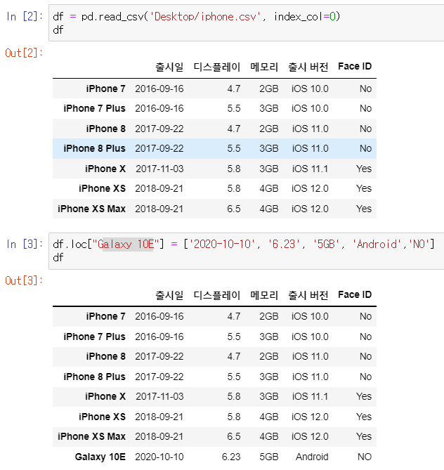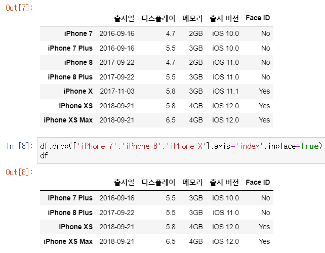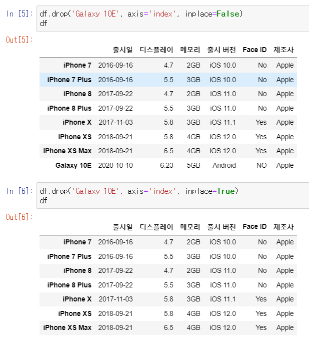 위의 예에서는 Galaxy 10E라는 Index를 삭제하는데요, 첫 파라미터는 Galaxy 10E로 넣고, axis는 index를 넣어 줍니다. 5번 Cell에서는 inplace에 False를 넣었고 df를 출력할 경우 Galaxy 10E가 그대로 있습니다. 6번 Cell과 함께 inplace에 Ture를 넣을 경우 df를 출력시 Galaxy 10E가 제거된 것을 확인할 수 있습니다.