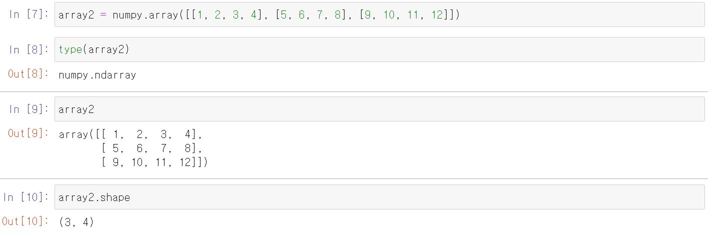 위의 이미지와 같이 array2는 리스트 안에 리스트들이 들어있는 2차원 리스트입니다. type함수를 사용할 경우 동일하게 ndarray가 나오며 shape함수를 사용하면 3행 4 열인 array이기 때문에 (3,4)가 출력됩니다.