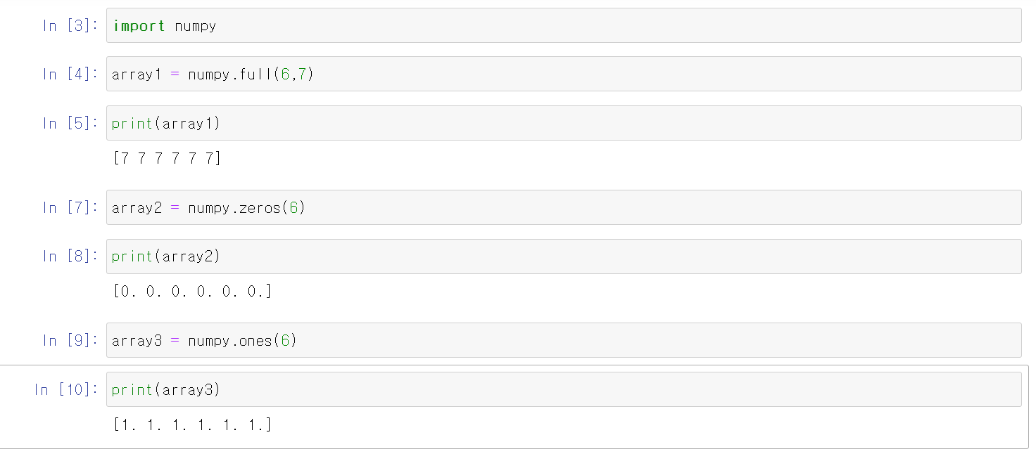 먼저 동일한 수로 이루어진 배열을 만드는 full(요소의 수, 요소)이 있으며 0으로만 이루어진 배열을 만드는 zeros, 1로만 이루어진 배열을 만드는 ones가 있습니다. 아래 이미지를 참고 부탁드립니다.