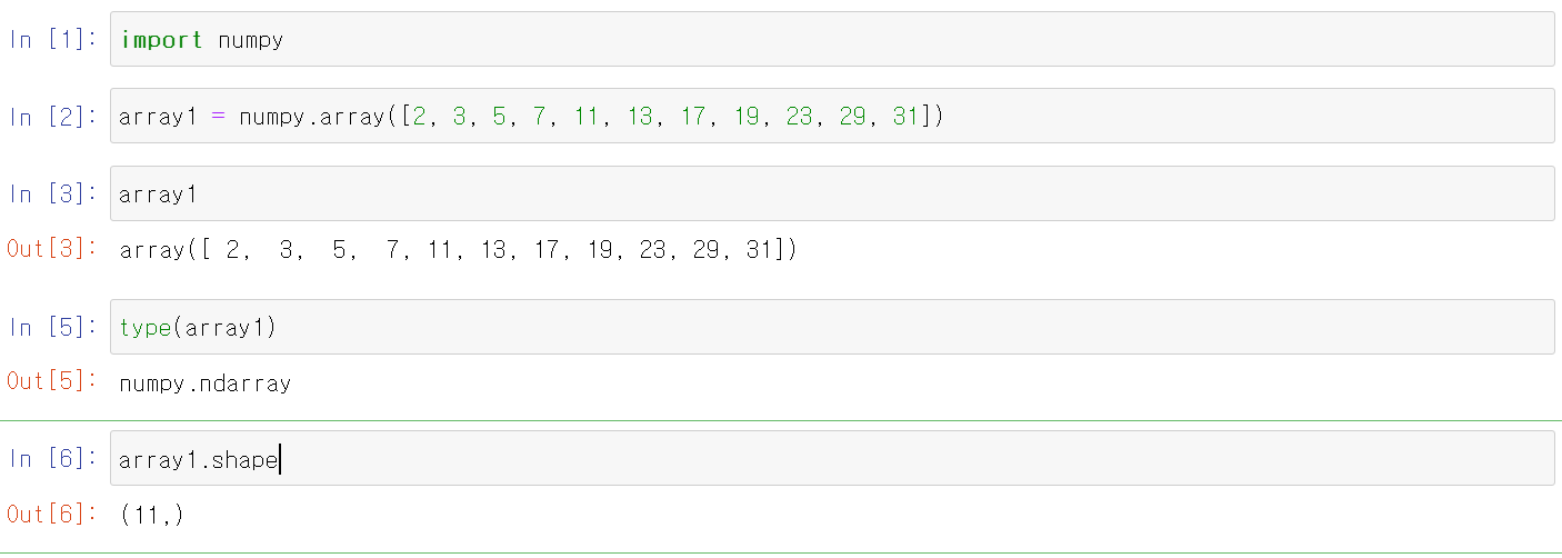위 코드들이 동작하는 것을 설명드리자면 1번 Cell에서 numpy를 사용할 수 있도록 만들고 2번 Cell에서 numpy내 array함수를 이용하여 배열을 만든 후 array1 변수에 할당해 주었습니다.(3번 Cell의 결과로 array1이 배열이 출력된 것을 확인할 수 있습니다.) 5번 Cell에서 array1의 type을 확인하기 위해 type함수를 사용하면 그냥 array가 아니라 ndarray가 출력됩니다. ndarray는 n-dimensional array의 약자로 n차원 배열을 뜻합니다.