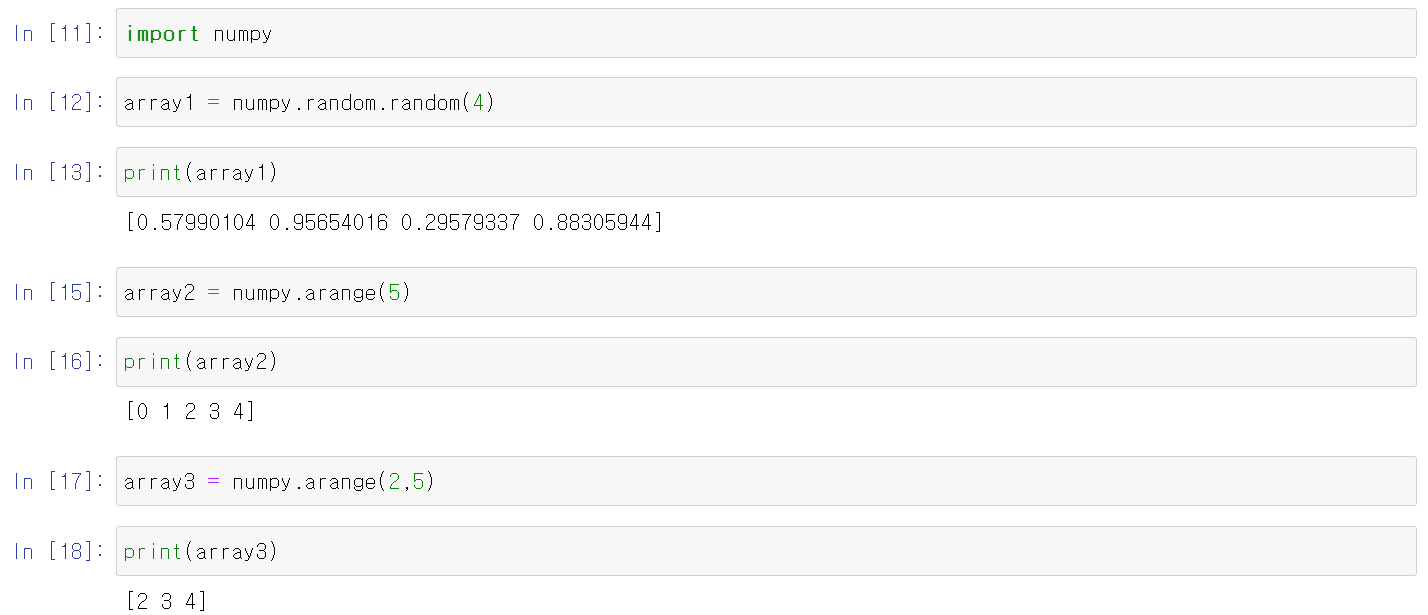 또한 연속된 수들의 배열을 만드는 arrange함수가 있는데요, arrage는 Python의 range함수와 비슷하게 동작합니다. 예를 들어 numpy.arrage(5)를 하면 1~5까지가 아닌 0~4까지의 요소를 포함하는 배열이 생성됩니다. 마찬가지로 아래의 예를 참고해주시기 바랍니다.