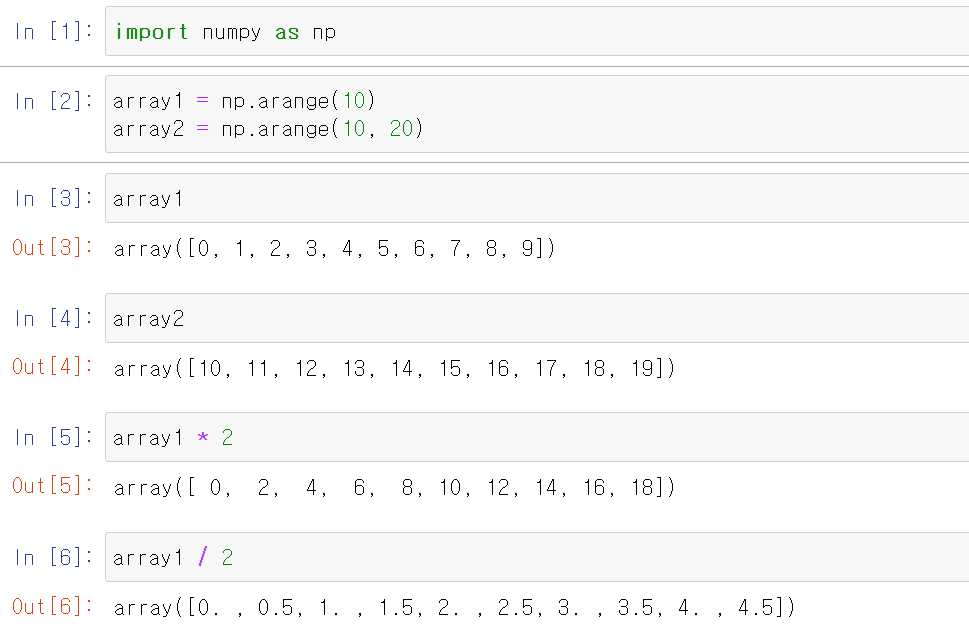 만약 numpy를 사용하지않고 array1의 요소들에 2씩 곱해준다면 for문을 사용하여 array[i] = array[i] * 2를 사용해야 합니다. 하지만 numpy를 사용하면 위와 같이 array1 * 2만 적으면 요소 전체에 2씩 곱해집니다. 물론 array1의 값을 바꿔주기 위해서는 array1 = array1 * 2로 적어야 합니다.