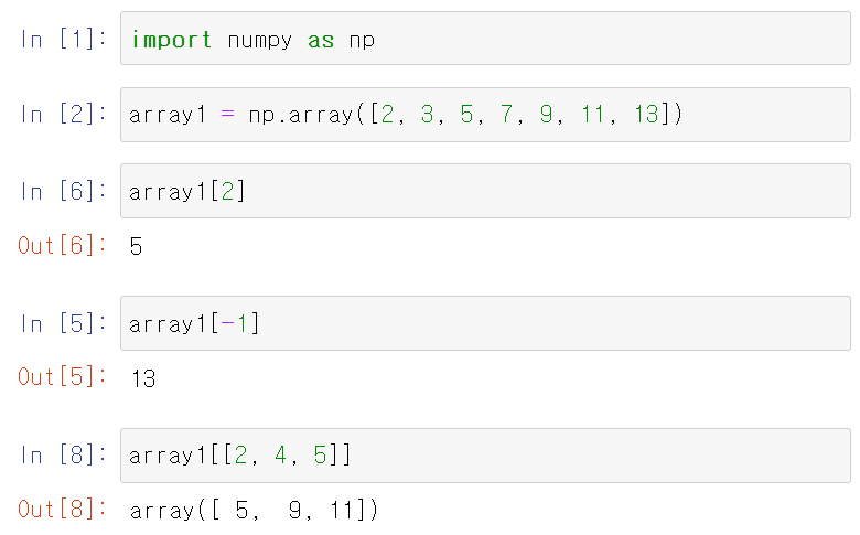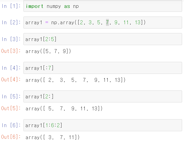 3번 Cell을 보시면 리스트의 슬라이싱과 같이 2번 인덱스에서 4번 인덱스(5번 아니에요!)까지 출력이 되는 것을 확인할 수 있습니다. 4번 5번 Cell에서 ':'는 끝까지라는 뜻으로 4번 Cell은 처음부터 7번 인덱스(array1은 6번 인덱스가 마지막이므로 6번까지), 5번 Cell은 2번 인덱스인 5부터 끝까지 다 출력해줍니다. 6번 Cell이 그나마 헷갈리실 수 있는데요,