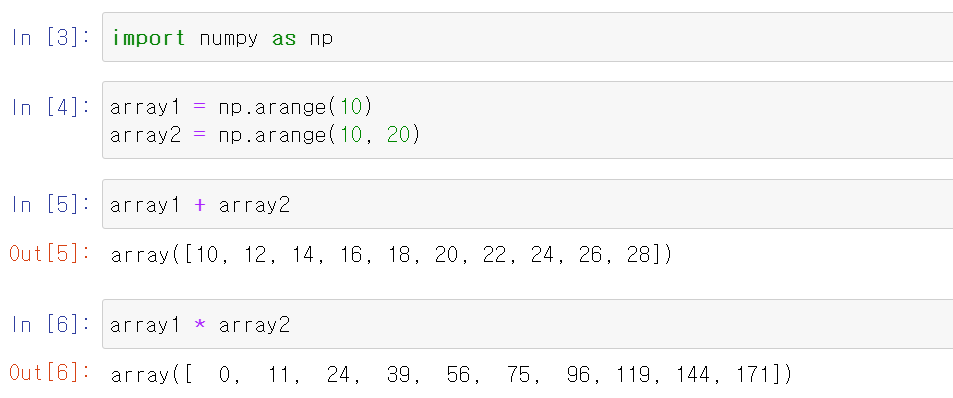 이뿐 아니라 요소의 수가 같은 array1과 array2의 같은 인덱스끼리의 연산도 가능합니다. numpy가 없다면 for문을 사용하여 코드 수가 길어지지만 numpy를 사용함으로써 간단하게 나타낼 수 있습니다.