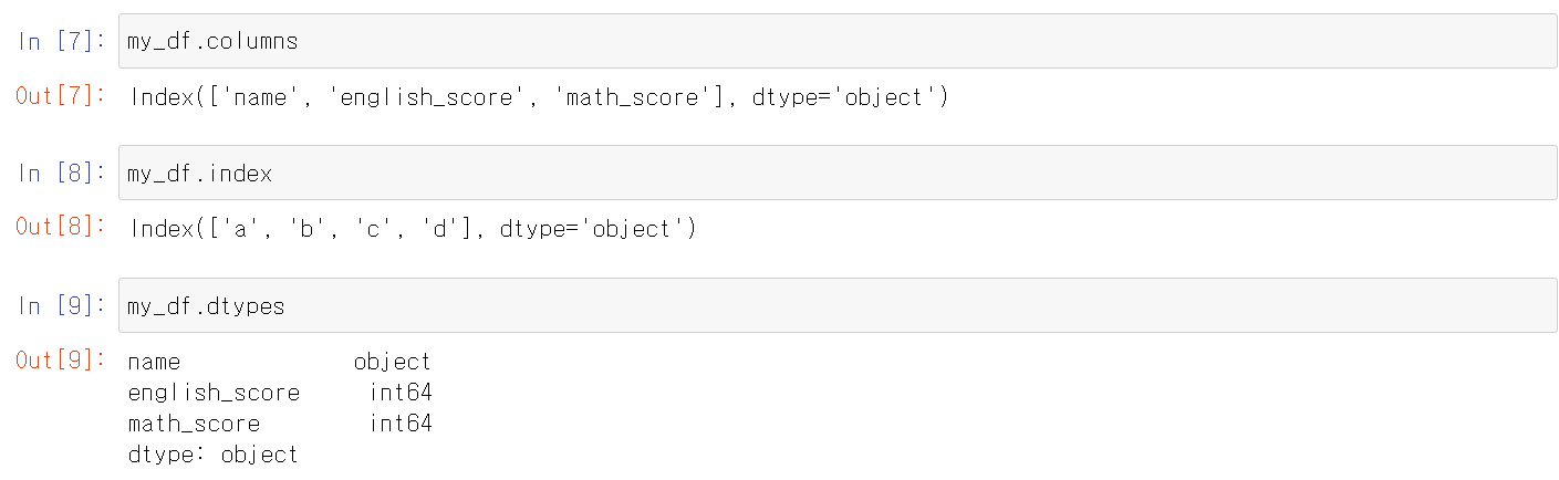 그런데 위의 Data Frame에서 row와 column이 0,1,2로 숫자로 되어있는 것을 확인하실 수 있으신데요, 이것은 따로 설정해주지 않았기 때문입니다. 처음 DataFrame을 만들 때 columns와 index를 사용하여 설정해줄 수 있습니다. 또한 DataFrame의 column(속성)의 type을 dtypes로 출력할 경우 각 column의 자료형은 다를 수도 있는 것을 확인하실 수 있습니다. 여기서 주의할 점은 하나의 column 내의 인자들은 동일한 자료형을 가져야 합니다!
