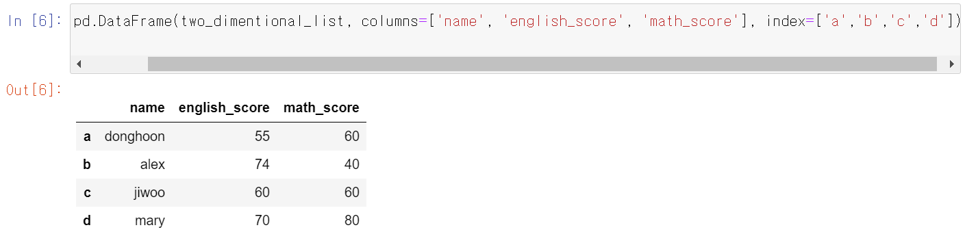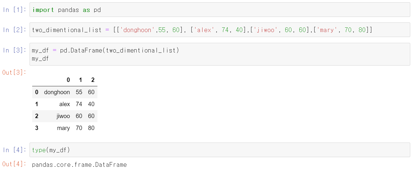 이제 Pandas를 이용해 Data Frame을 만들어 보겠습니다. Numpy와 마찬가지로 import로 모듈을 불러온 후 DataFrame함수를 이용하여 표로 만들 수 있습니다. type을 이용하면 DataFrame인 것을 확인하실 수 있습니다.