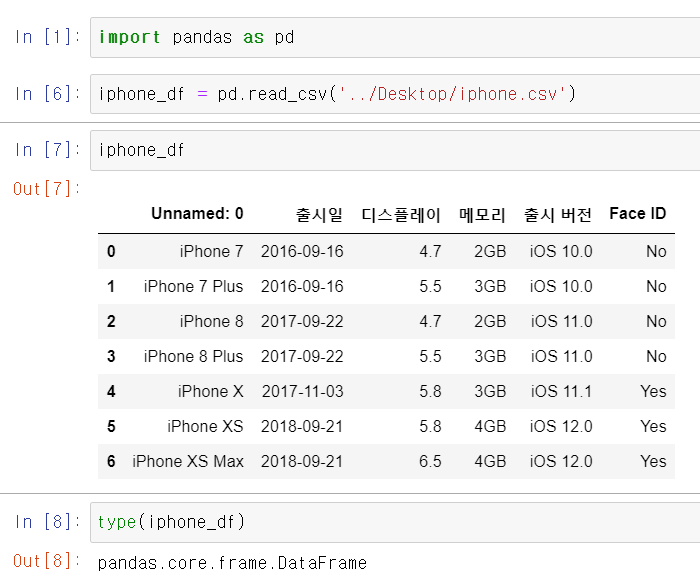 여기서 Header가 자동으로 Column의 이름으로 들어간 것도 확인하실 수 있습니다. Pandas에서 자동으로 CSV 파일의 첫 줄을 헤더로 인식을 하기 때문인데요, 좋은 점이긴 하지만 만약 Header가 없게 된다면 두 번째 줄인 iPhone 7로 시작하는 줄이 Column의 이름이 되게 됩니다. 이것을 막으려면 read_csv함수 뒤에 header=None을 남겨주어야 합니다.