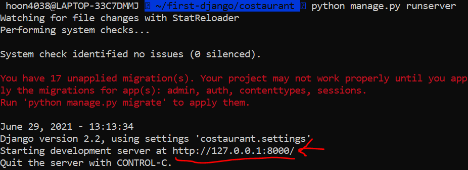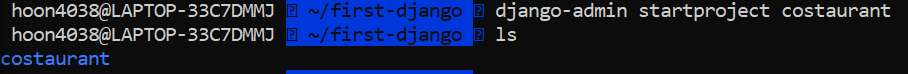 django-admin startproject costaurant ← costaurant라는 이름의 프로젝트를 생성해 줍니다