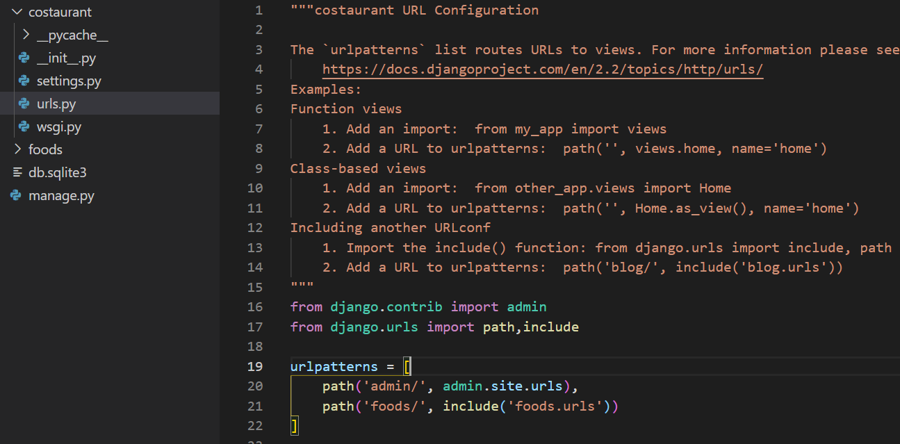 from django.urls import path뒤에 include를 추가해 줍니다! 하지만 여기서 foods App 안에는 urls.py 파일이 없기 때문에 저희가 만들어 주어야 합니다. 그 후 costaurant project의 urls.py 파일안의 내용을 그대로 붙여 넣어 줍니다. 여기에